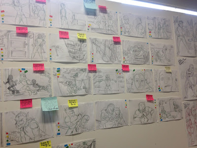 As part of finishing the clean up and tweaking in betweens, The next part of the storyboard checklist to put red and yellow stickers on panels to indicate what is and what needs finishing as I go into the final stage of the project.
